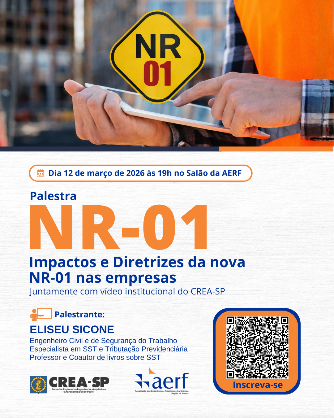 No dia 12 de março de 2026, às 19h, acontecerá no Salão da AERF uma importante palestra sobre “Impactos e Diretrizes da nova NR-01 nas empresas”.