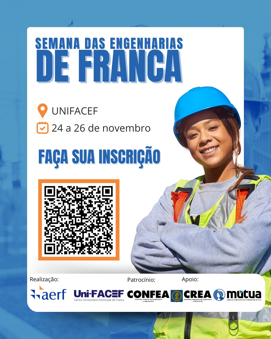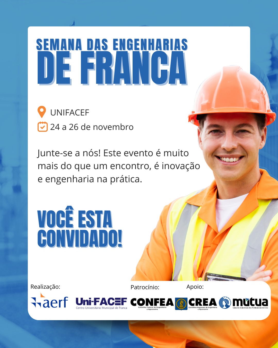 A Semana das Engenharias de Franca é uma realização da AERF – Associação dos Engenheiros, Arquitetos e Agrônomos da Região de Franca, com patrocínio do Confea, Crea-SP e Mútua.